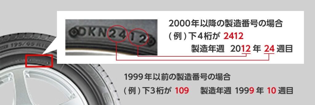 ※合わせて、長期経過タイヤの点検・交換(製造年週の確認方法)も参照ください。