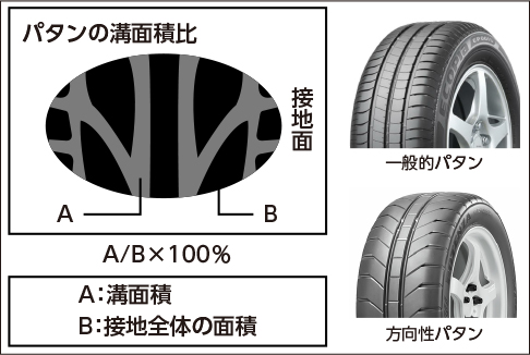 タイヤの溝面積を増加させれば排水性が向上し、ウェット性能が高まります。反面、溝の面積が多くなるとパタンの剛性が低下してドライ性能が低下します。タイヤ・パタン(タイヤの模様)はこのバランスを考慮して作り込まれています。ロープロファイルタイヤ※の場合、タイヤ幅が広く排水性能を強く求められますが、ドライ性能も重要である為、溝面積を抑えても排水性能を維持できるパタンとして方向性を持たせたタイヤがあります。