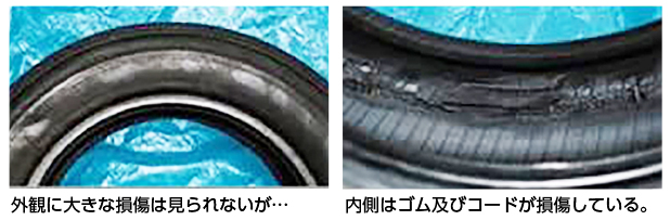 タイヤは一種の圧力容器です。傷を受けるとその圧力容器の役目ができなくなる危険性があります。タイヤ内部のコード(糸)が損傷を受けたタイヤは使用不可です。ゴムのみの損傷であってもタイヤ走行中の屈曲により損傷部分に“ひずみ”が集中し、損傷部を拡大させる可能性があります。タイヤが走行中に傷を受けないよう心がけてください。