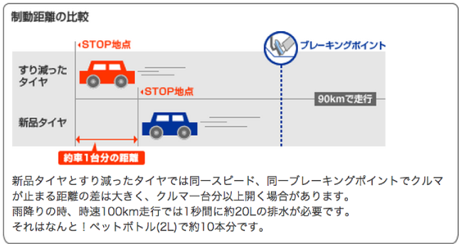 パタンの主要な役目の一つが雨天時の走行でタイヤの下に入ってくる水を効率良く排水することです。パタンの溝の深さは雨の日のブレーキ性能に大きな影響を与えます。タイヤが摩耗するとパタンの溝は浅くなってゆき、水を排水する能力が低下し制動距離が伸びる恐れがあります。(※法律でも溝の深さ1.6mm以下に摩耗したタイヤは使用不可とされています。道路運送車両の保安基準 第2章9条に規定)