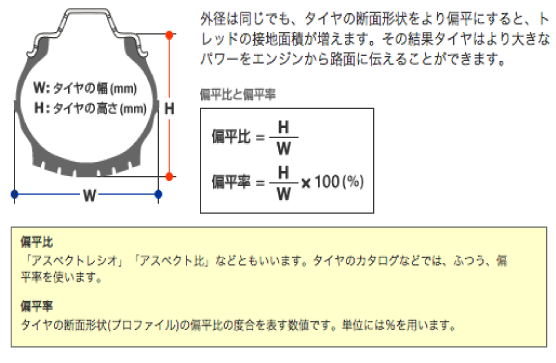 - ロープロタイヤはサイド部が狭く、目視によるタイヤサイド部のたわみ状態から空気圧の低下を確認する事は困難です。その為、低内圧走行になり易く、定期的な空気圧管理が重要です。
