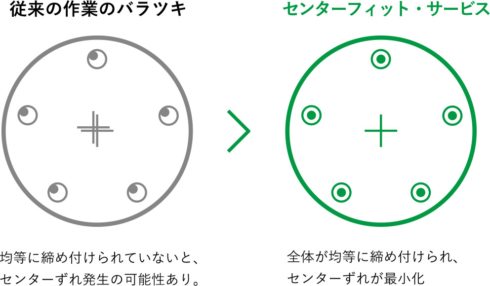 「センターフィット」を行うことで、①走行中の振動が軽減、②ハンドリング性能の向上、③直進安定性の向上、④コーナリング性能の向上に貢献。つまり、ドライブがもっと快適で楽しくなるサービスです。